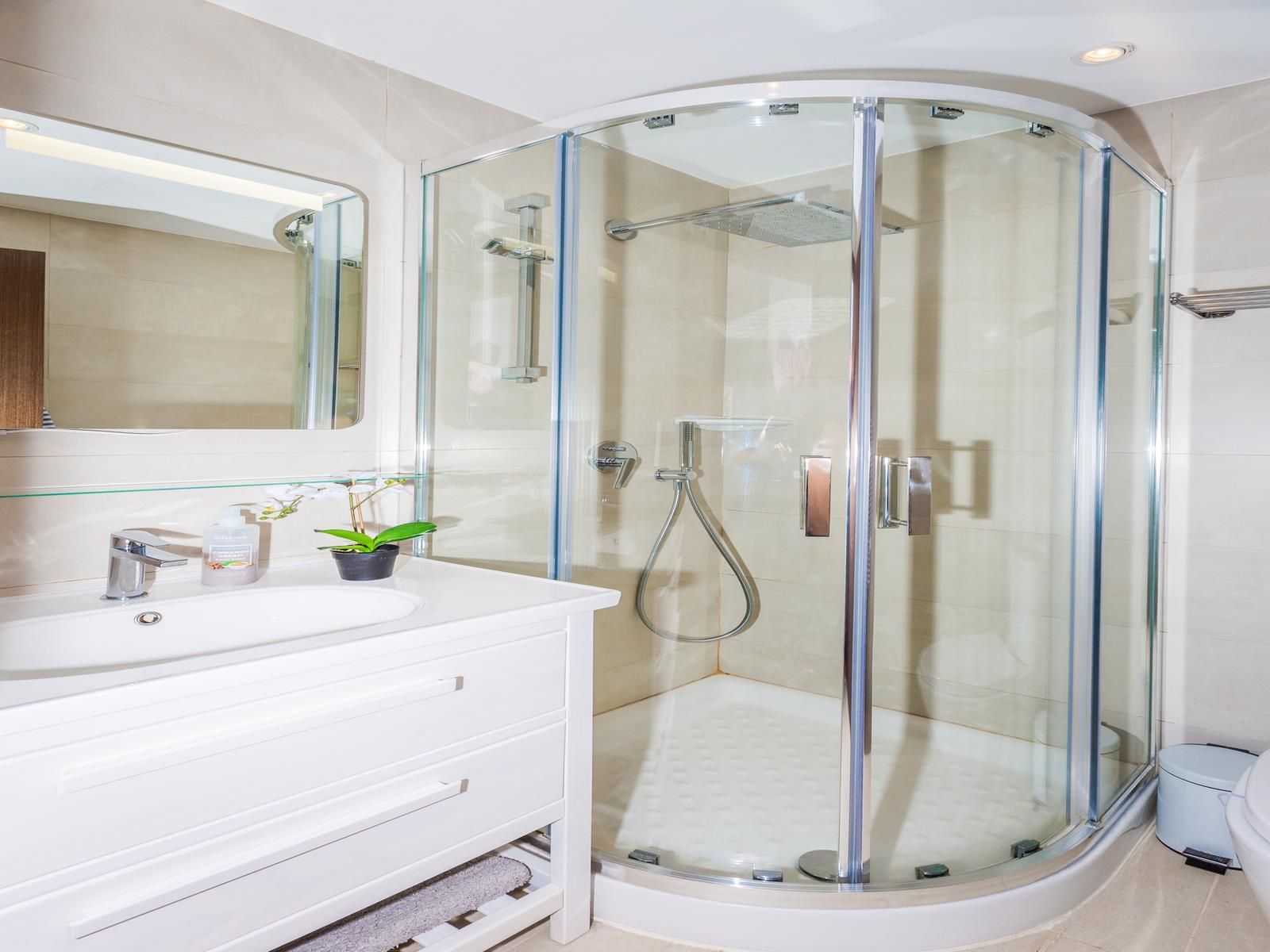 • Ванная комната с раковиной, душем, туалетом и феном
