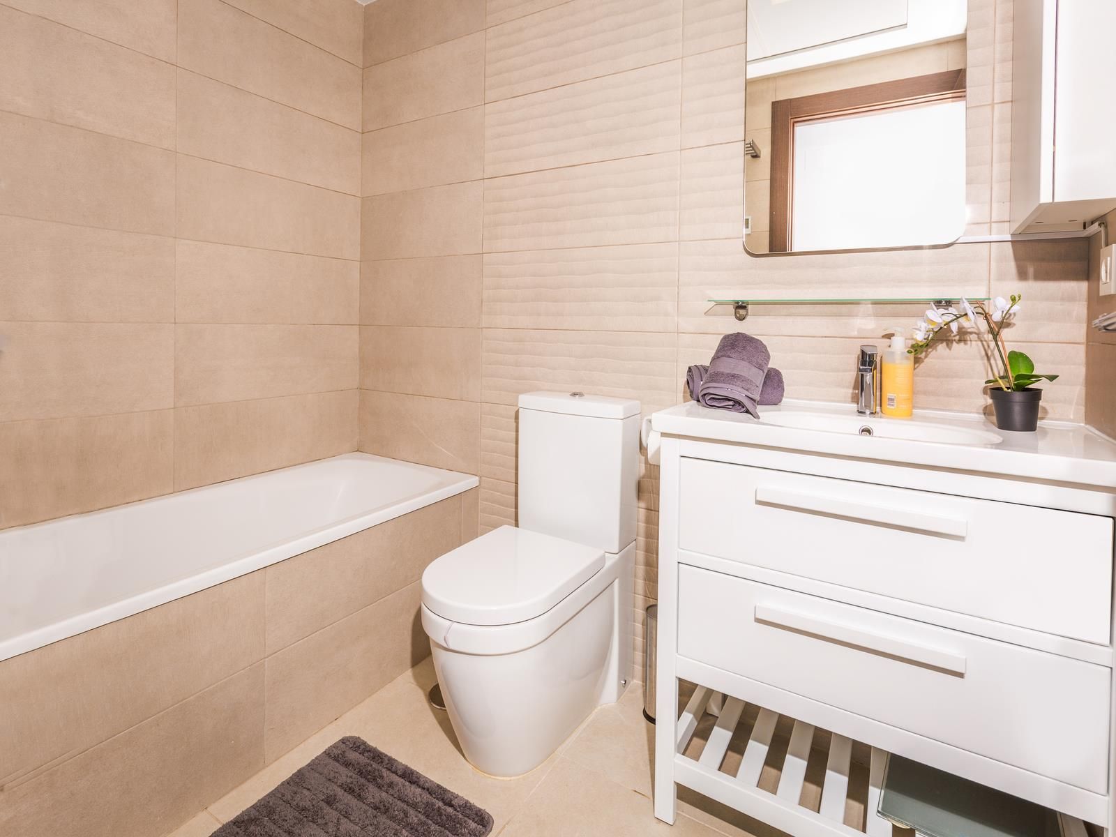 • Ванная комната с раковиной, ванной/душевой кабиной, туалетом и феном