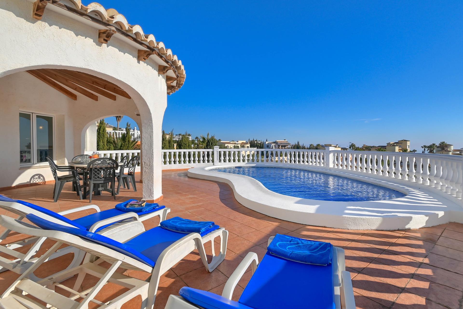 Maravillosa y cómoda villa en Benitachell, Costa Blanca, España, con piscina privada para 6 personas. La casa está situada en una zona residencial de playa, a 4 km de la playa de Cala Moraig y a 4 km de Poble Nou de Benitachell.