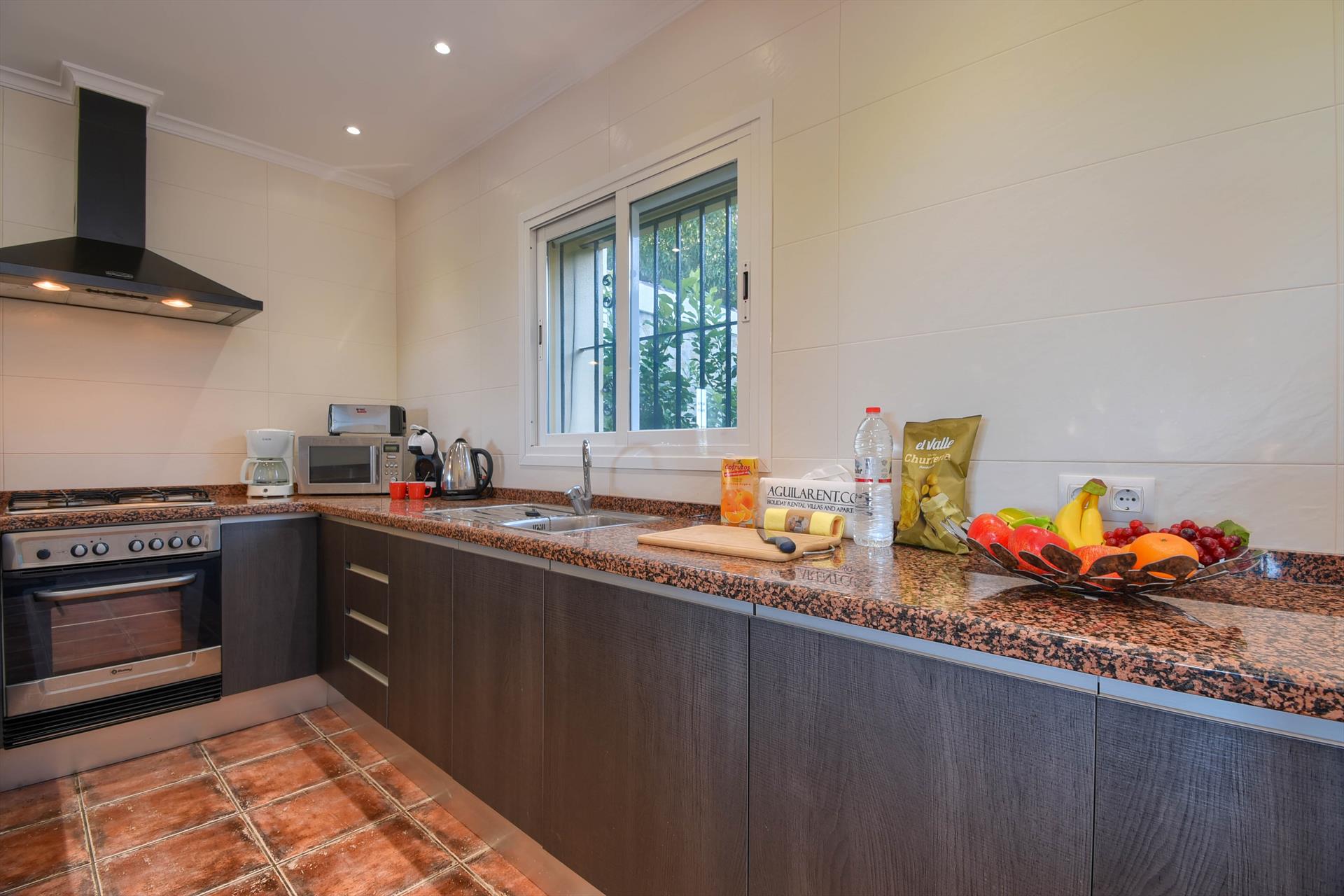 • cocina abierta con fogones de gas, horno eléctrico, microondas, lavavajillas, frigorífico-congelador, cafetera, hervidor eléctrico, batidora, tostadora y exprimidor