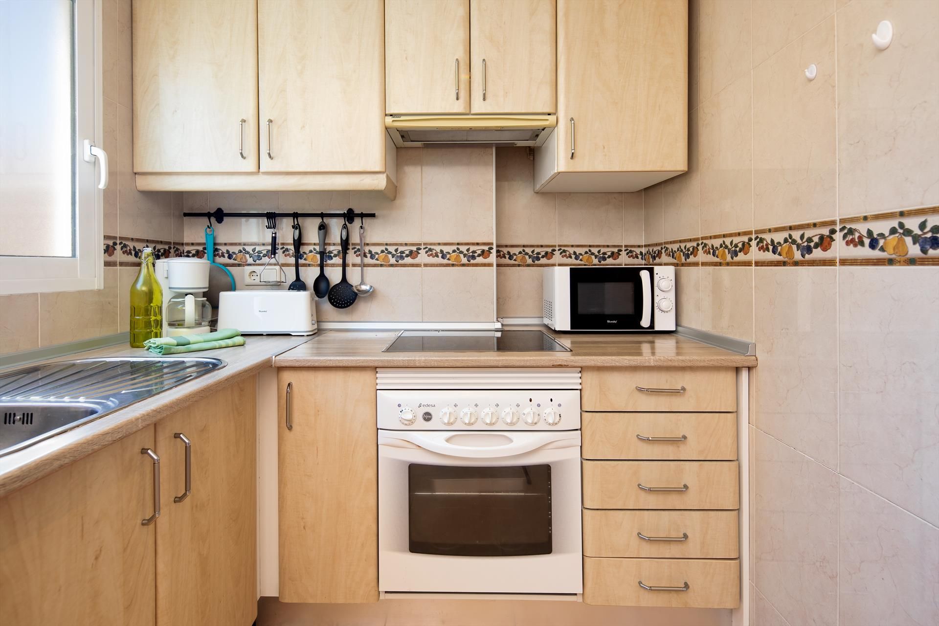 Interior: Frigorífico, encimera y horno o grill eléctrico, cafetera, tostadora, hervidor de agua, plancha y tabla de planchar, batidora.