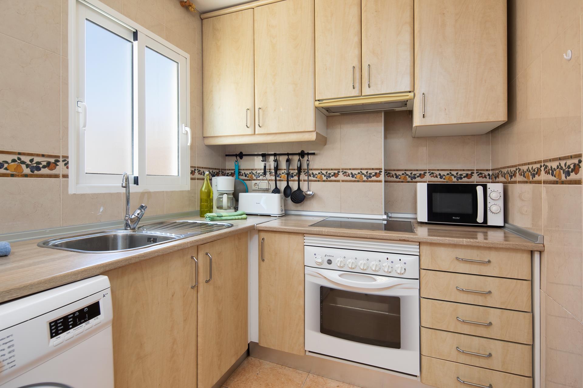 • cocina con placa eléctrica, horno eléctrico, microondas, lavavajillas, frigorífico-congelador, cafetera, hervidor eléctrico y tostadora