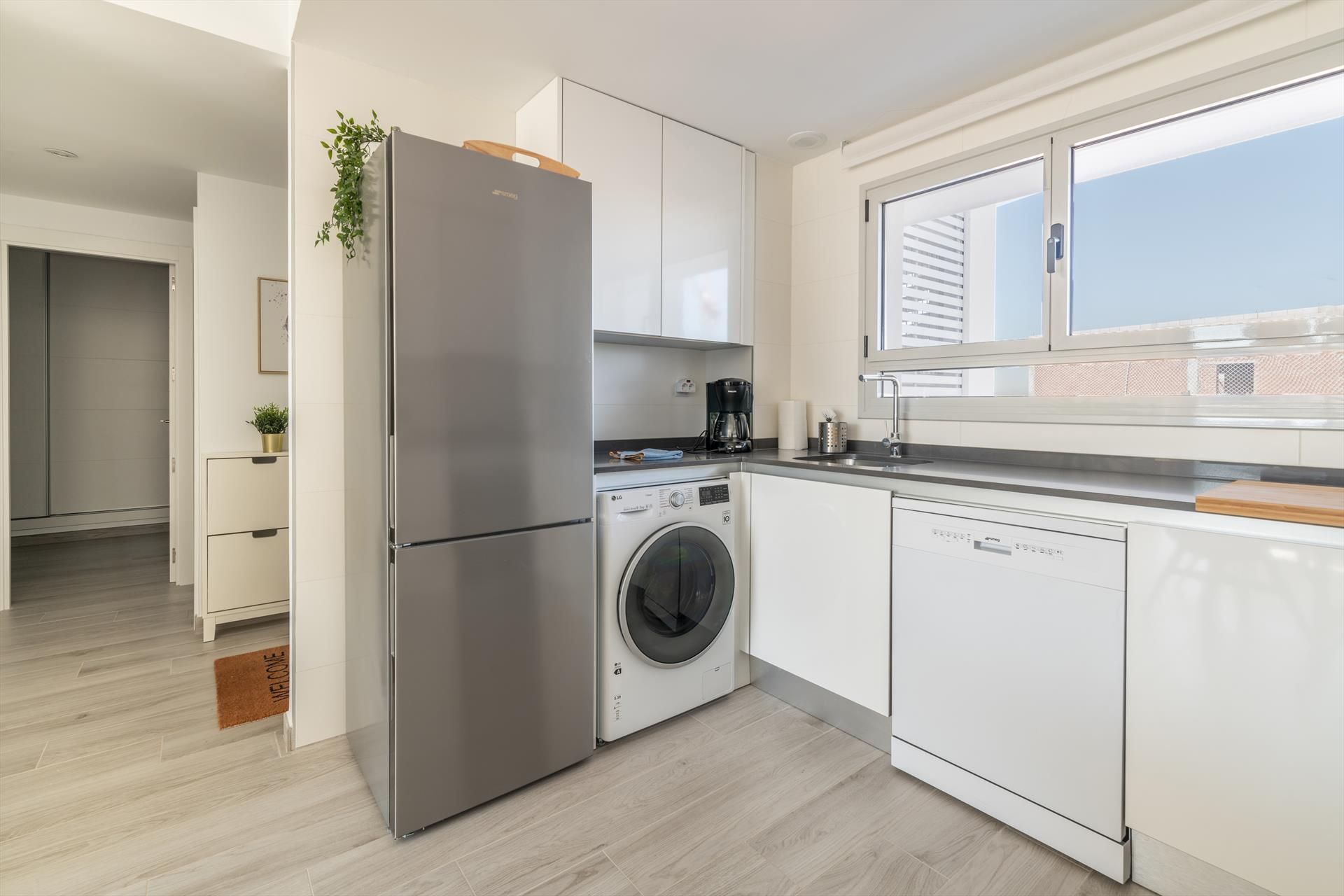 • cocina abierta con placa eléctrica, horno eléctrico, microondas, lavavajillas, refrigerador, congelador, cafetera, tetera eléctrica, batidora, tostadora y extractor de jugo