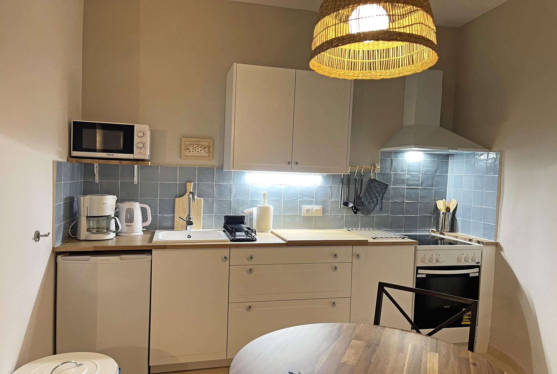 Interior: Frigorífico, encimera y horno o grill eléctrico, cafetera, tostadora, hervidor de agua, plancha y tabla de planchar, batidora.