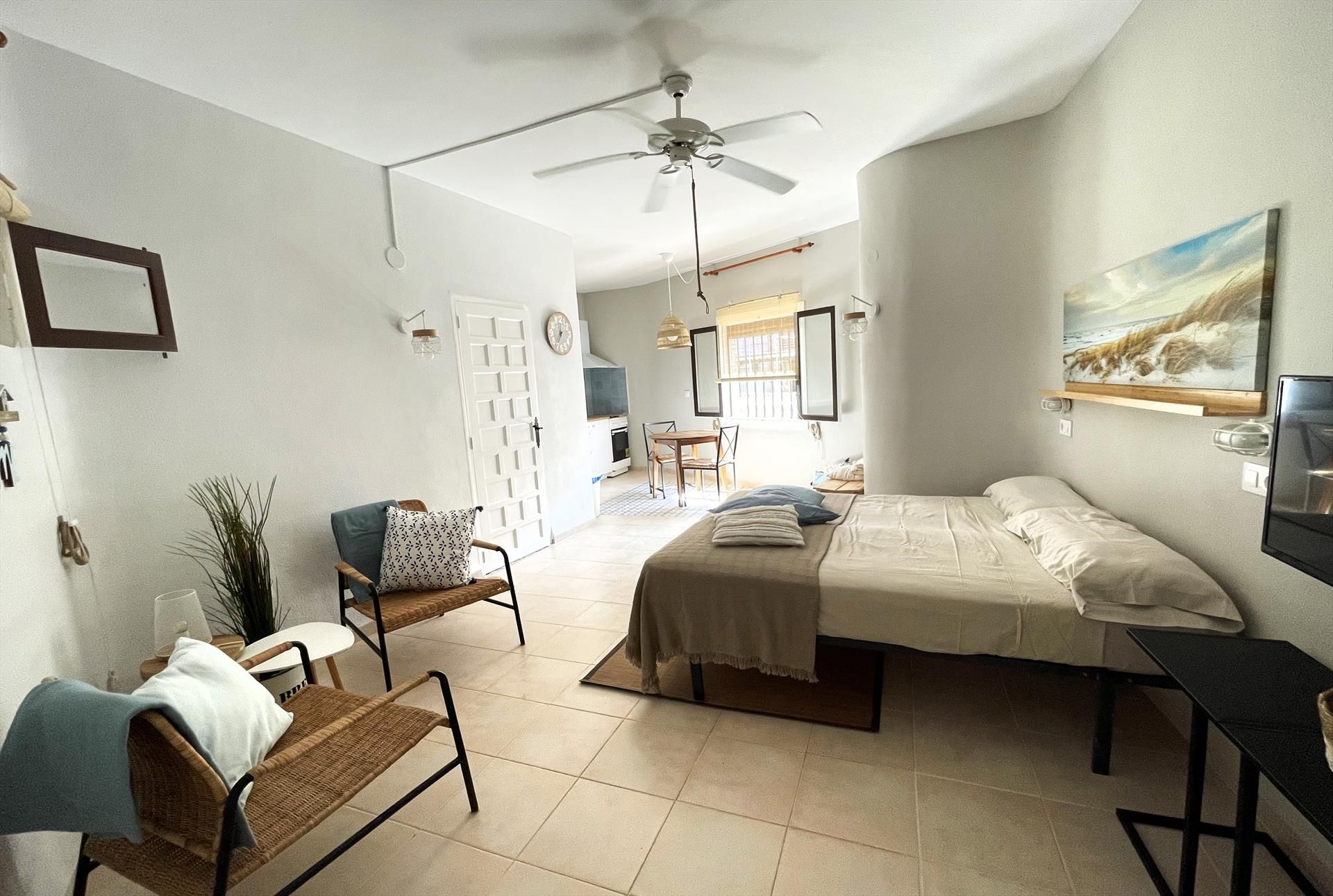 Hermoso y alegre estudio en Denia, Costa Blanca, España, para 2 personas. El estudio se encuentra en una zona residencial cerca de la playa, próximo a restaurantes, bares, supermercados y a solo 25 m de la playa de Les Bovetes.