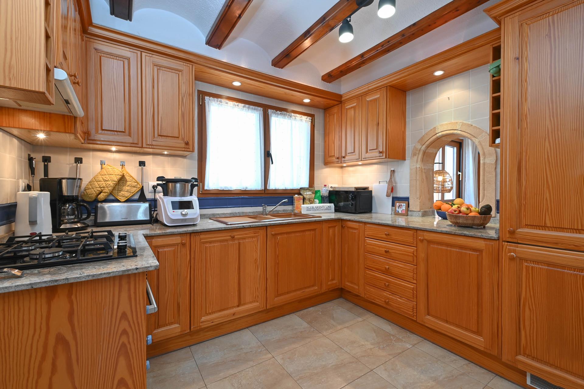 • cocina con fogones a gas, horno eléctrico, lavavajillas, frigorífico-congelador, cafetera, hervidor eléctrico, batidora, tostadora y exprimidor