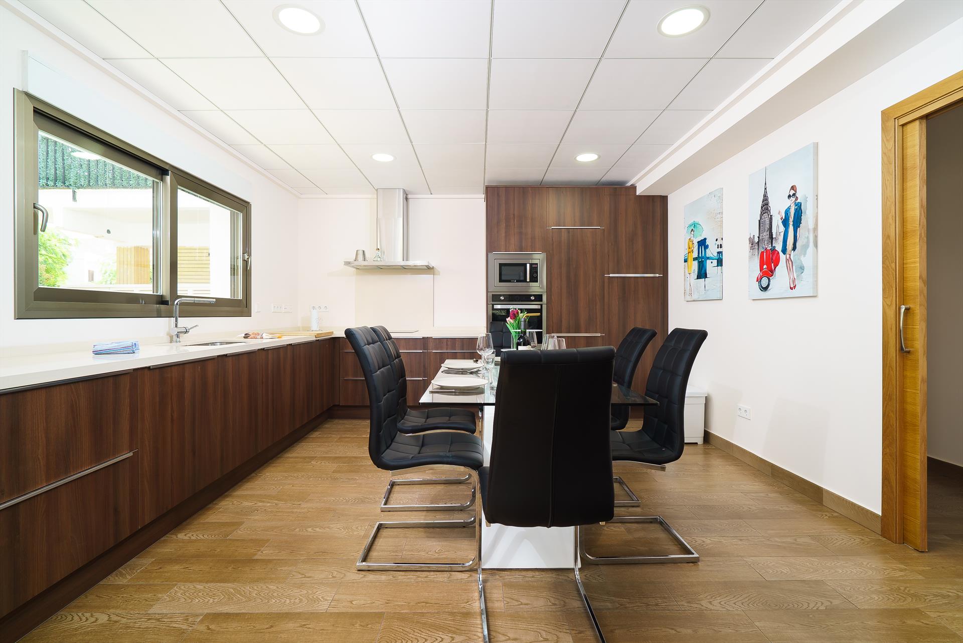 • cocina abierta con placa eléctrica, horno eléctrico, microondas, lavavajillas, frigorífico, congelador, cafetera, hervidor eléctrico, batidora, tostadora y exprimidor