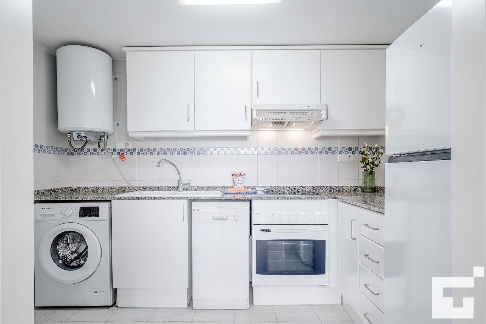 🍳 Küche, ausgestattet mit Cerankochfeld, Backofen, Mikrowelle, Waschmaschine und Geschirrspüler.
