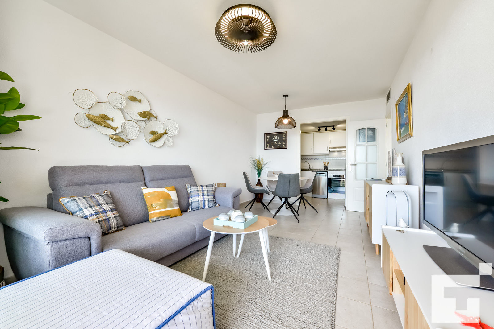 📺 Helles Wohn-Esszimmer ausgestattet mit IPTV und Deckenventilator.