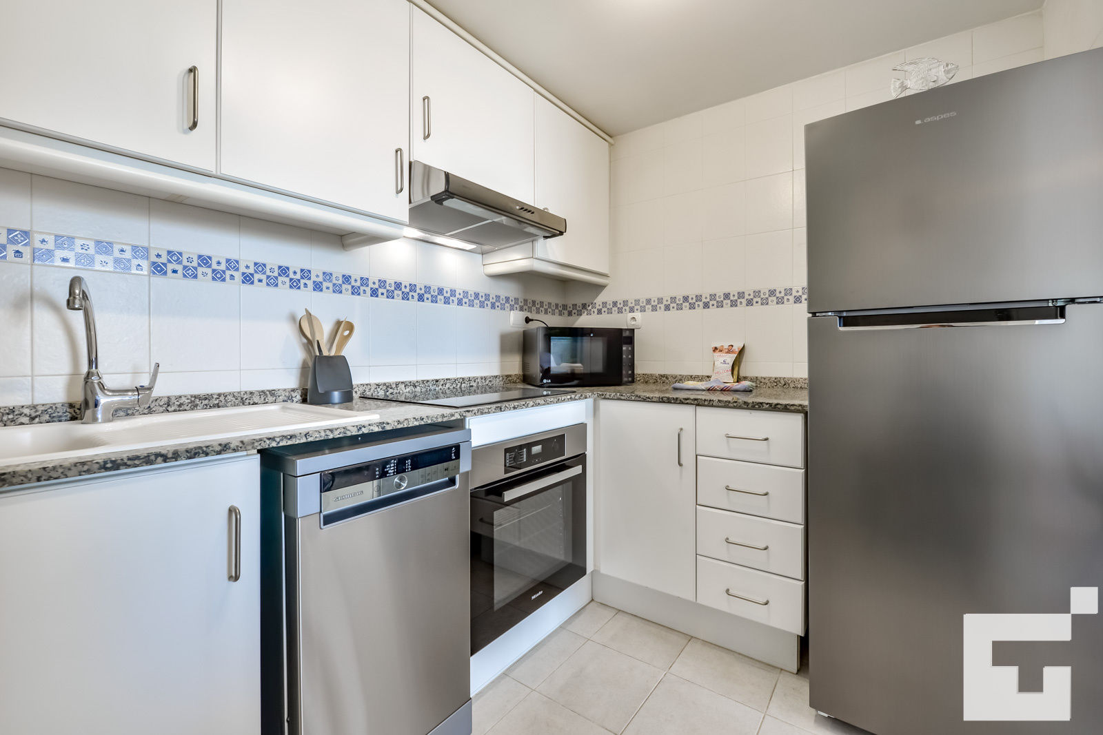🍳 Voll ausgestattete Küche mit Cerankochfeld, Backofen, Mikrowelle, Geschirrspüler, Waschmaschine und Kühlschrank.