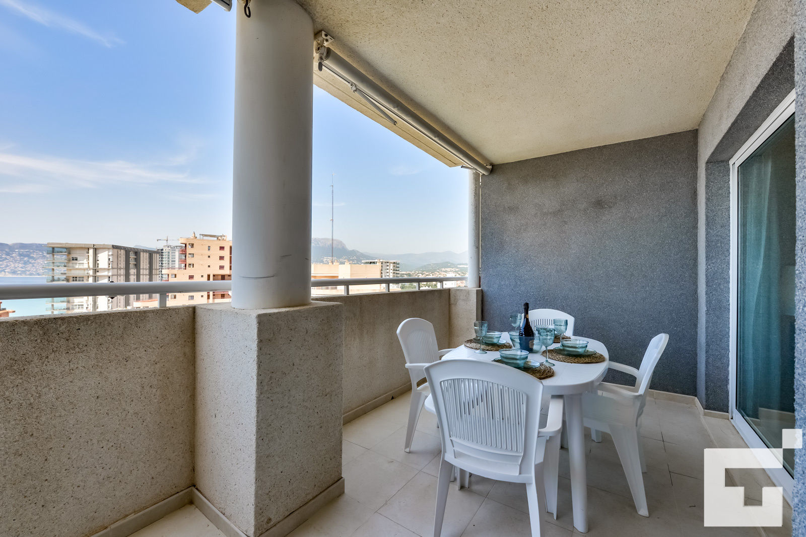 🪟 Große möblierte Terrasse mit Blick auf das Meer und den Hafen von Calpe.