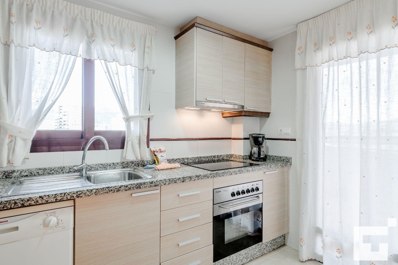 🍳 Fully equipped kitchen with ceramic hob, oven, microwave, refrigerator, and dishwasher.