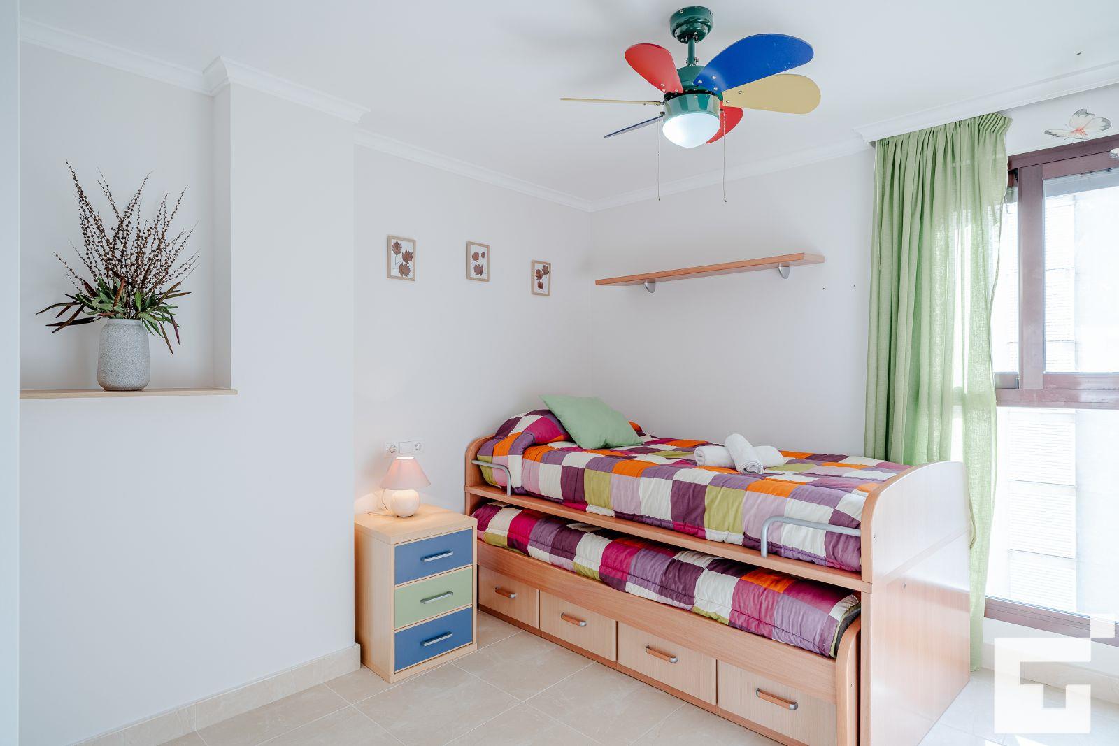 - 1 bedroom with a trundle bed and ceiling fan.