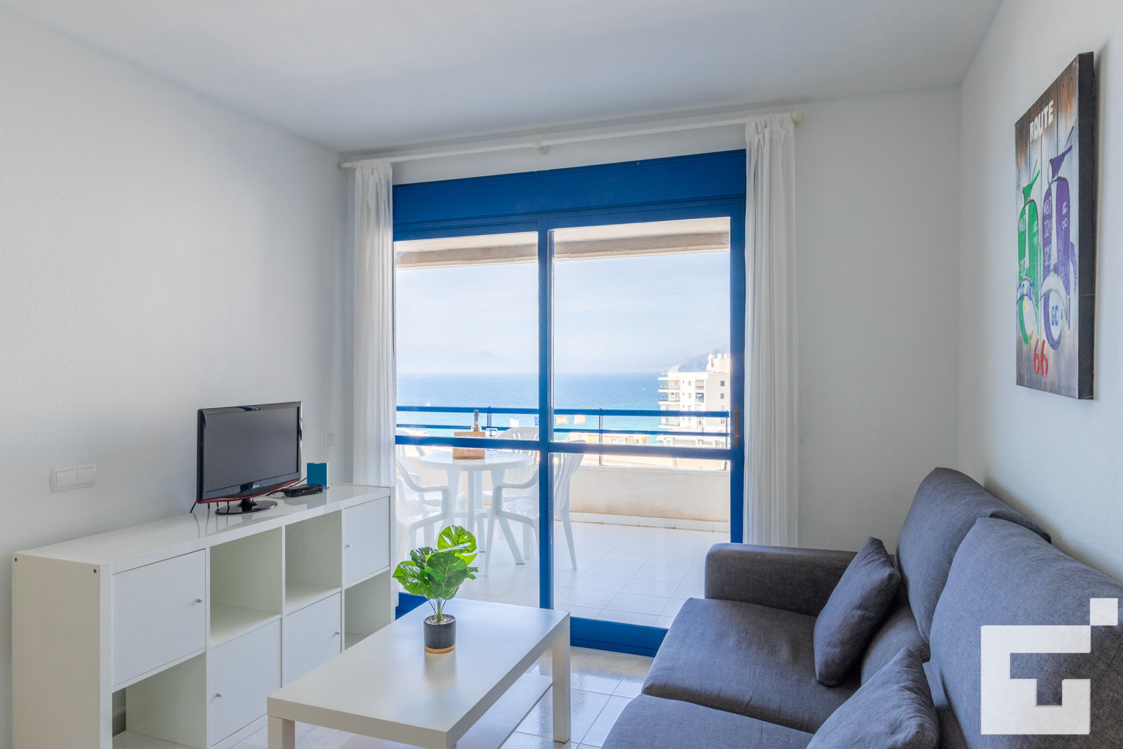 📺 Living-dining room with TV and access to the furnished terrace.