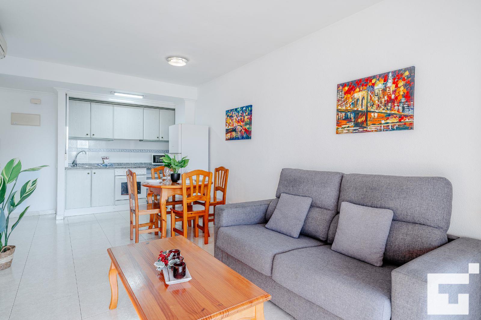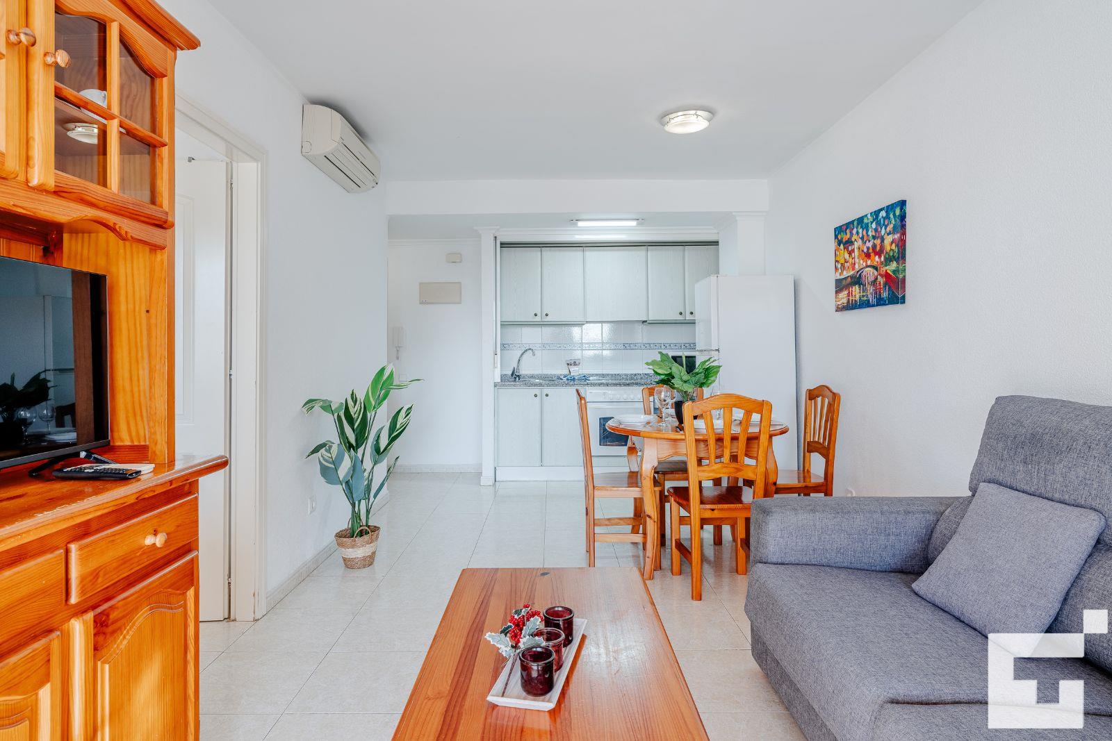 📺 Bright living-dining room with TV and access to the furnished terrace.