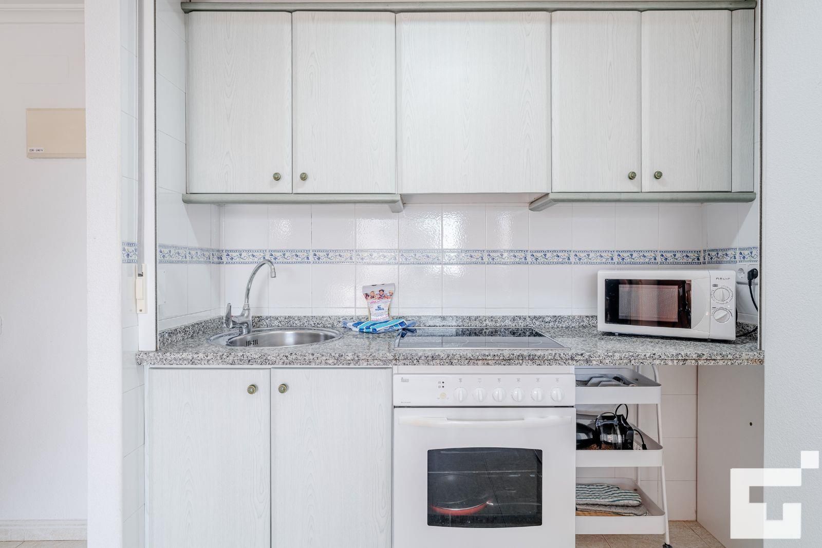 🍳 Open-plan kitchen equipped with ceramic hob, oven, microwave, and refrigerator.