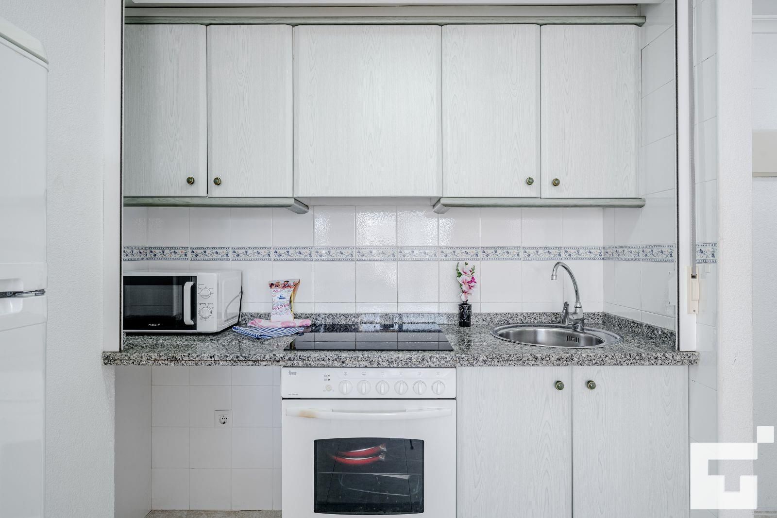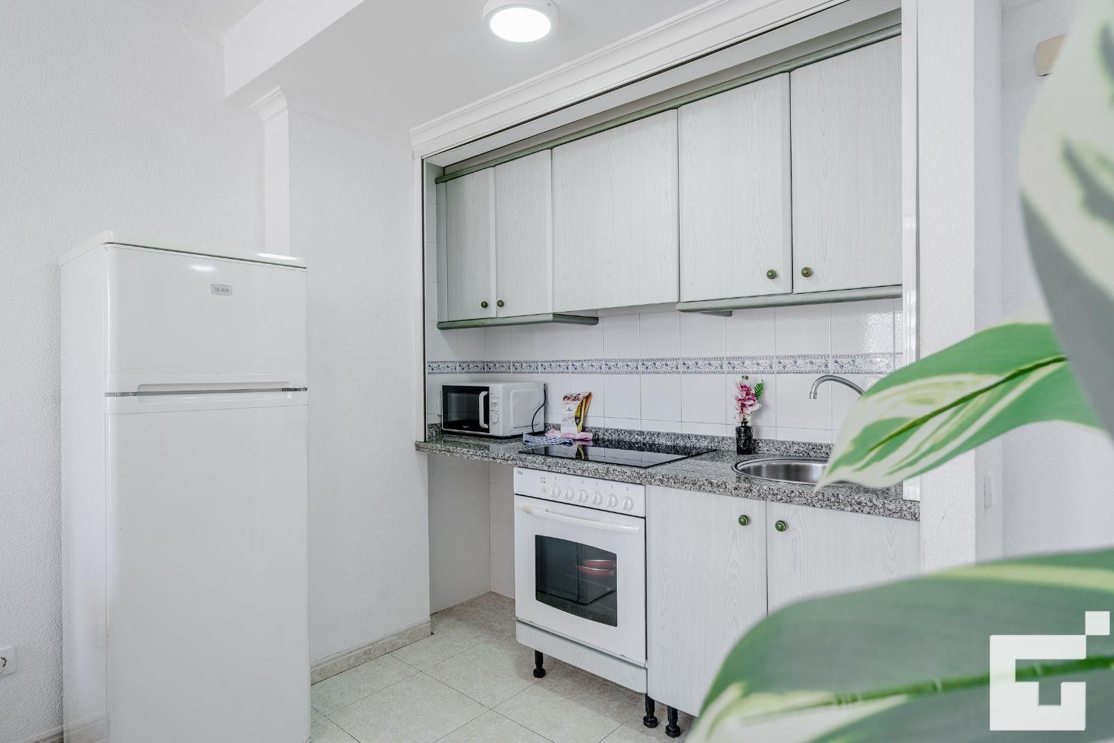 🍳 Open-plan kitchen connected to the living room, equipped with a ceramic hob, oven, microwave, and refrigerator.