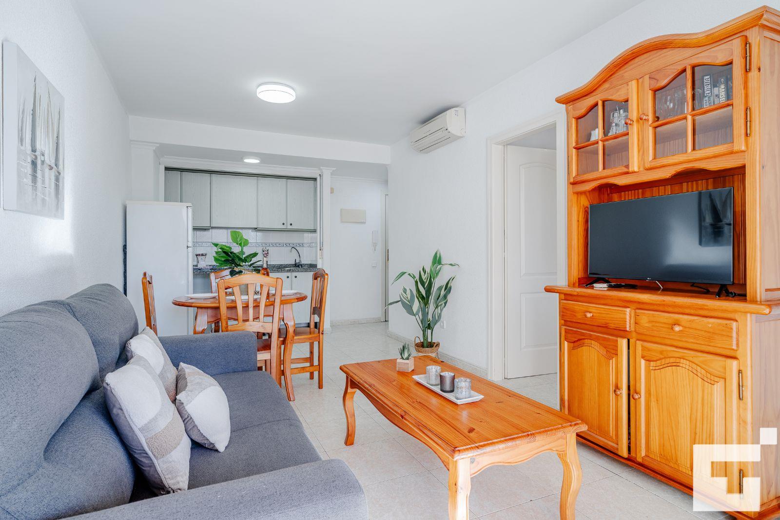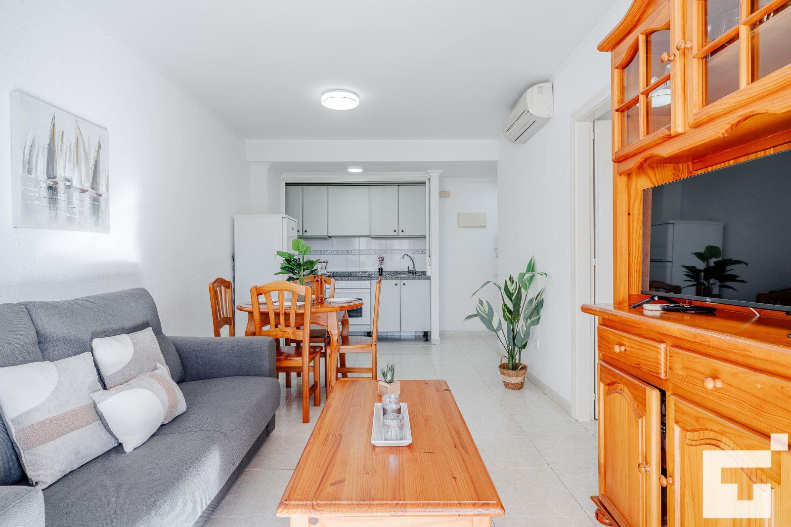📺 Spacious living-dining room with TV and access to the furnished terrace.