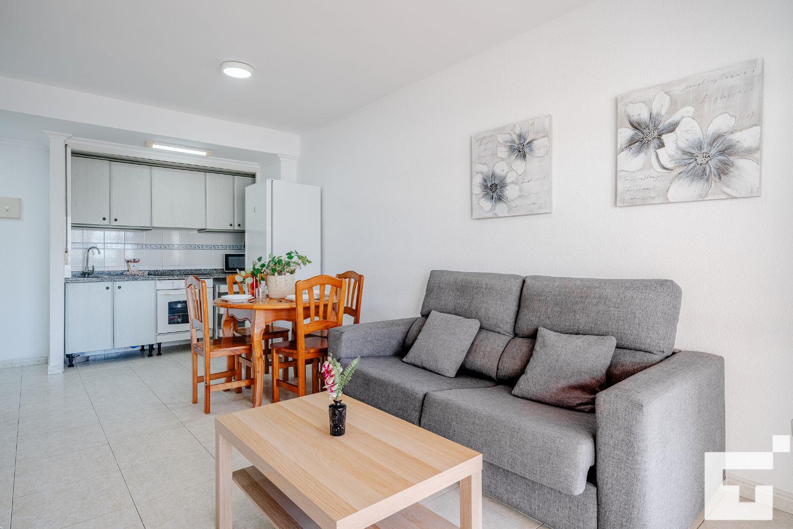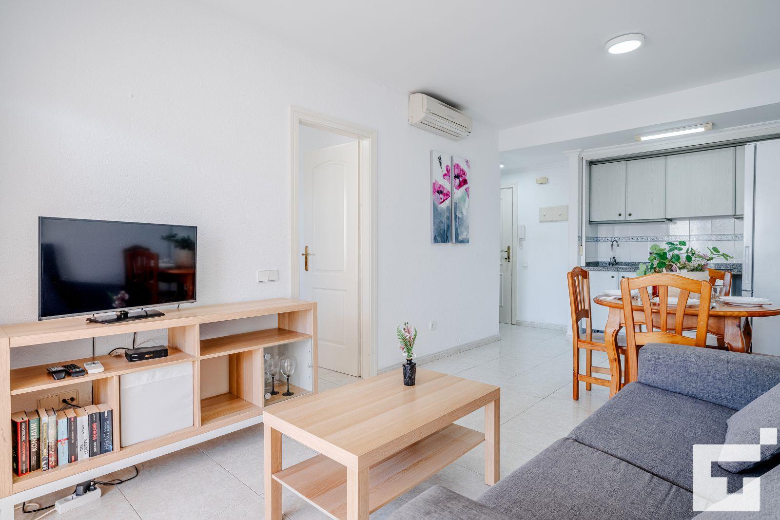📺 Bright living-dining room with TV and access to the furnished terrace.