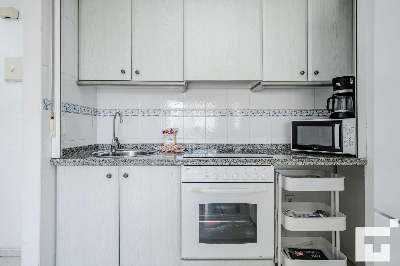 🍳 Open kitchen, equipped with a ceramic hob, oven, microwave, and refrigerator.