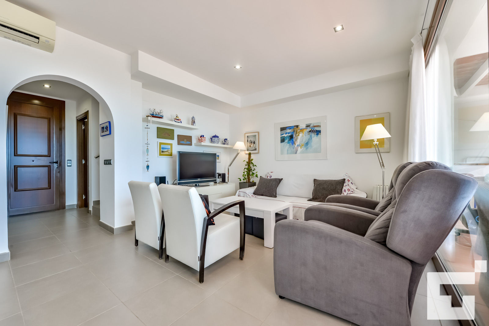 📺 Bright living-dining room with a Smart TV and access to the terrace and pool area.