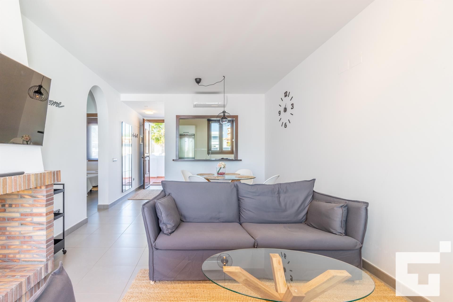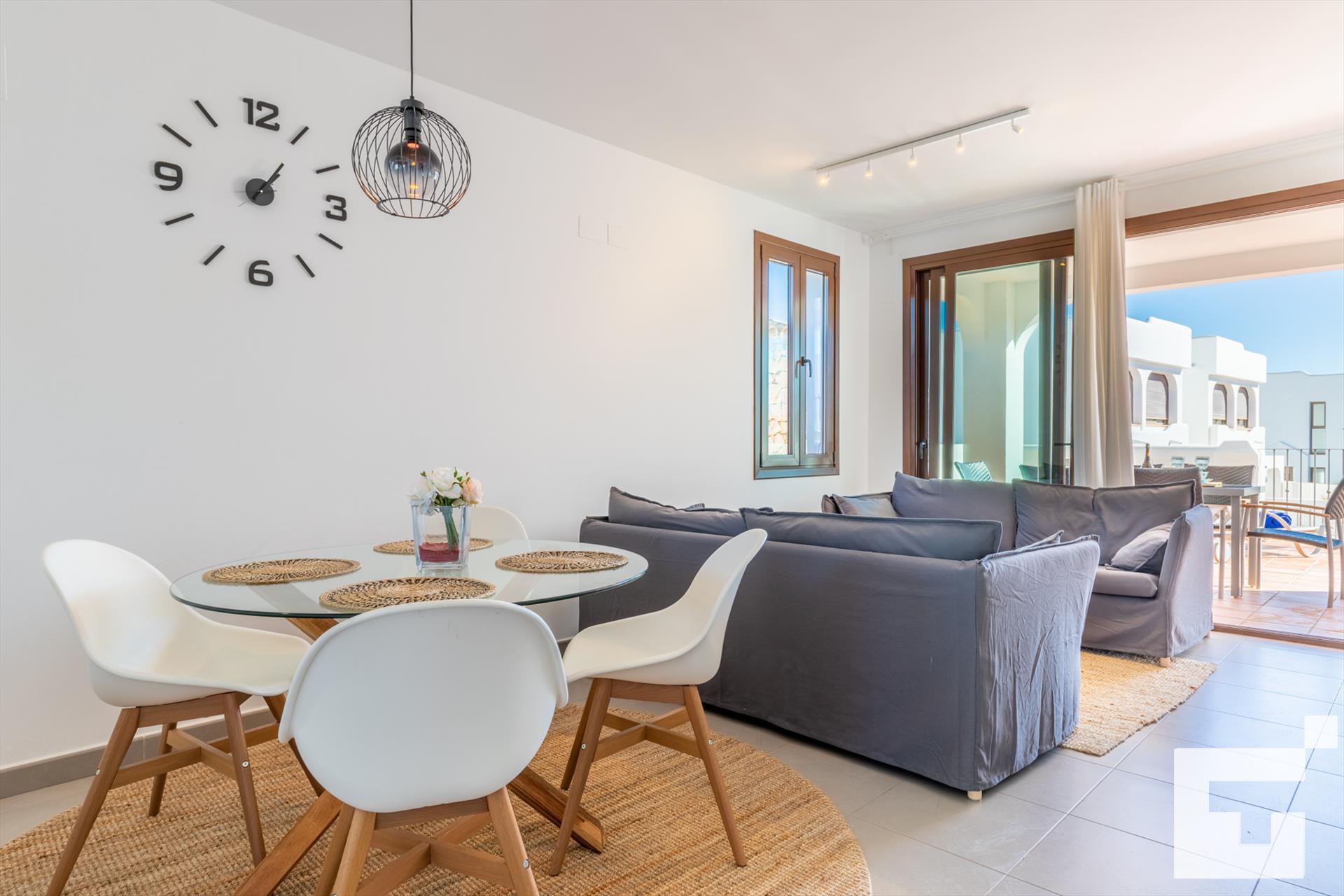 📺 Spacious living-dining room with TV and access to the furnished terrace.