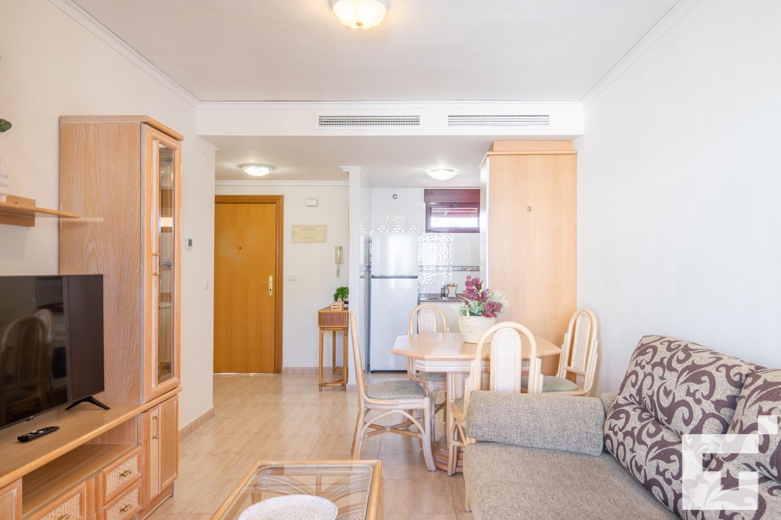 📺 Woon-/eetkamer met tv en toegang tot het gemeubileerde terras.